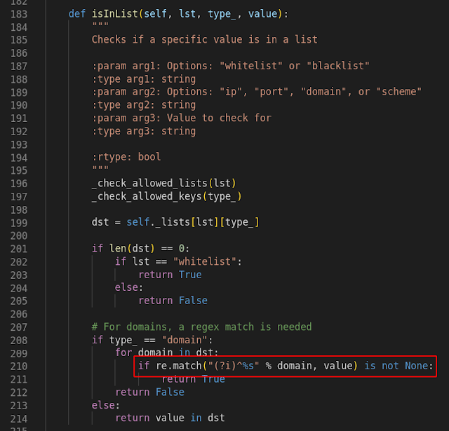Veo que compara el dominio al que se está intentando hacer la petición con todos los de la lista que define el usuario, pero hay algo raro. La regex tiene el símbolo "^" obligando a que el valor introducido empiece con el dominio que va obteniendo de la lista de la configuración, pero no se define su final (correspondería al símbolo "$" en la expresión regular). Esto hace que se pueda alargar el valor del dominio al que queremos enviar la petición tomando como base uno definido en la lista blanca.